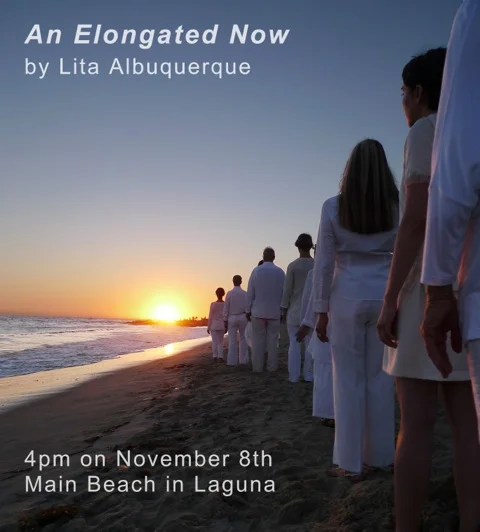 Lita Albuquerque’s performance piece An Elongated Now, involving hundreds of volunteer performers dressed in white, takes place on Main Beach and may be viewed from various vantage points on the beach and along the cliffs.