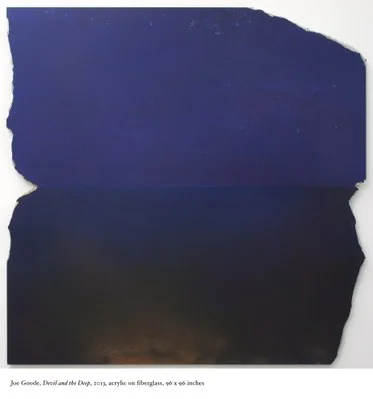 With these new pictures, some as large as a multi-plex cinema screen, Goode has hacked and chopped around the perimeters. They look as though they were decomposing through the wear and tear of passing time. The luscious surfaces were not generated by computer programs but painted by the artist himself, his hand perfecting subtle hues from marine blue to sunny gold. Executed on panels of fiberglass, there is an unreal sheen to them that paradoxically activates thoughts of mediated nature rather than actual nature. Inevitably, the glowing swaths of color balanced horizontally also recall Rothko, the embattled genius fighting the encroachment of banal reality. Goode, however, subsumes the quotidian into his representations of the higher realms. Dare I say the greater good? By Goode?